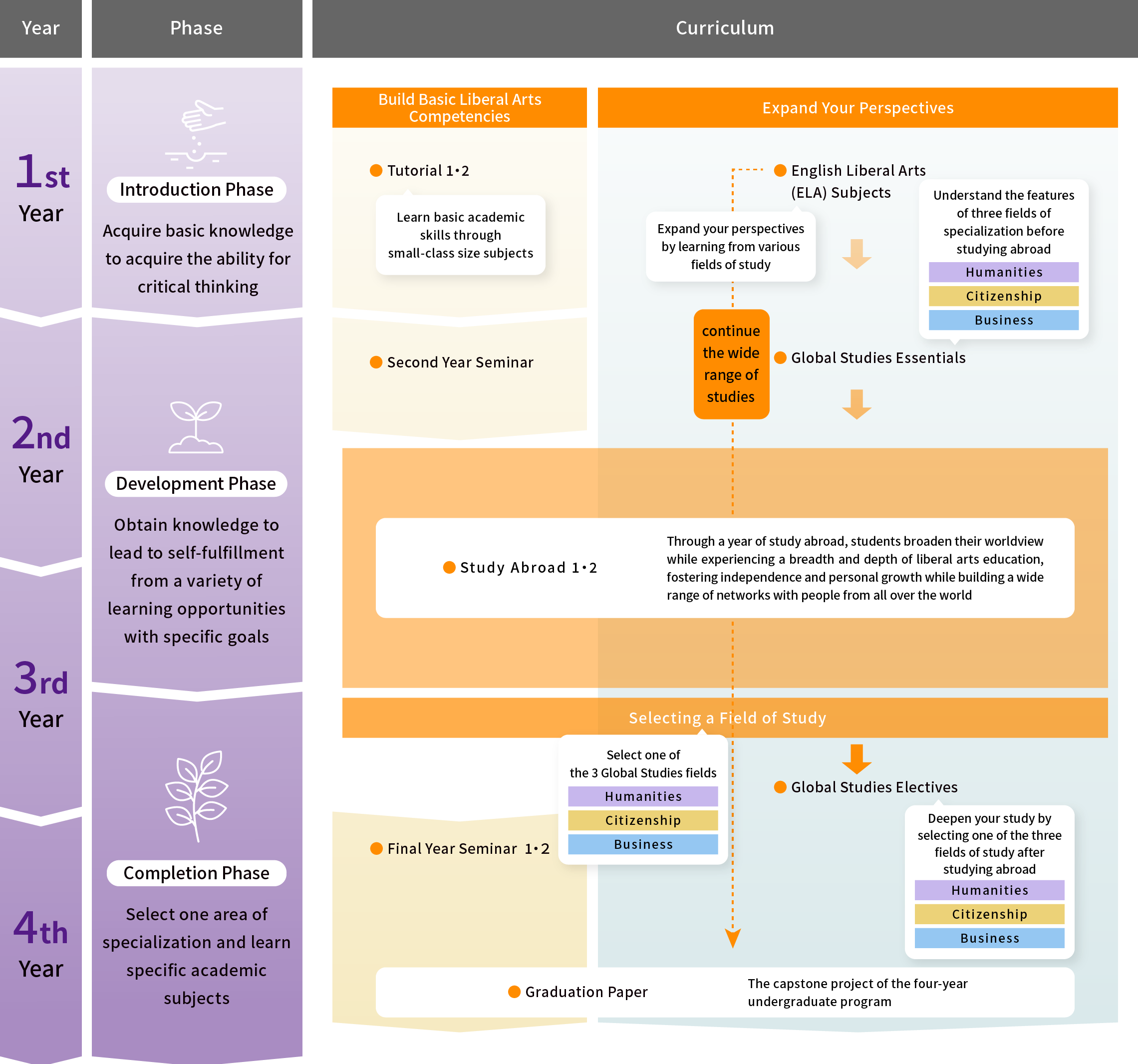 GLAP students accumulate a wide variety of learning experiences in order to become a new type of global leader. Before studying abroad, GLAP students learn a wide range of fields, mainly Humanities, Citizenship, and Business. After students return from their study abroad experience, they select one from the above three fields and engage in specialized studies to deepen their understanding and complete the Graduation Paper.