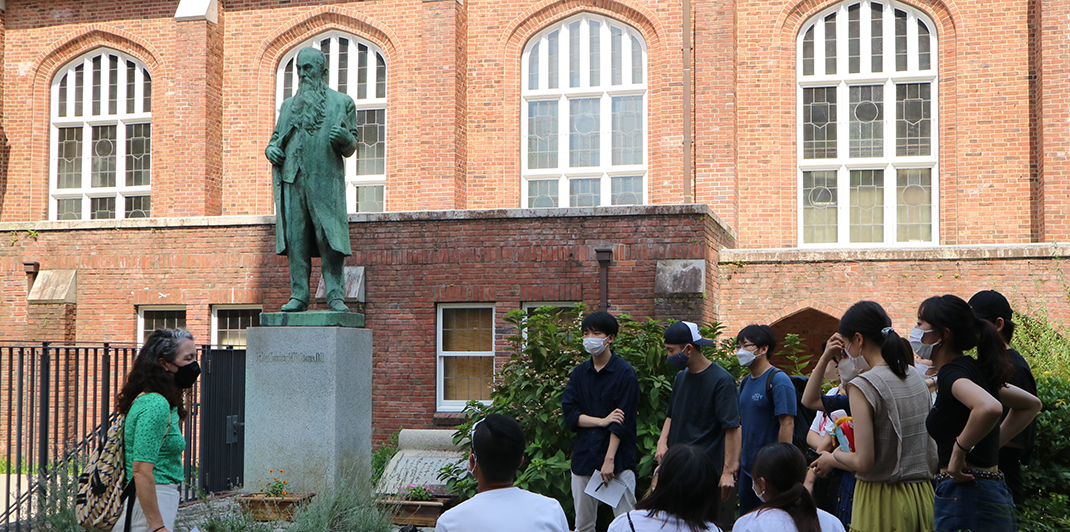 Based on the students’ suggestions, we visited the statue of “Bishop Williams,” the founder of St. Paul’s School (Rikkyo University), the “Mather Library Memorial Hall/ Rikkyo Gakuin Exhibition Hall,” which is the university’s history museum, and the “Global Lounge,” which is a space for exchange and learning with international students. Some were places that the students use on a regular basis, while others were places that they were visiting for the first time.
